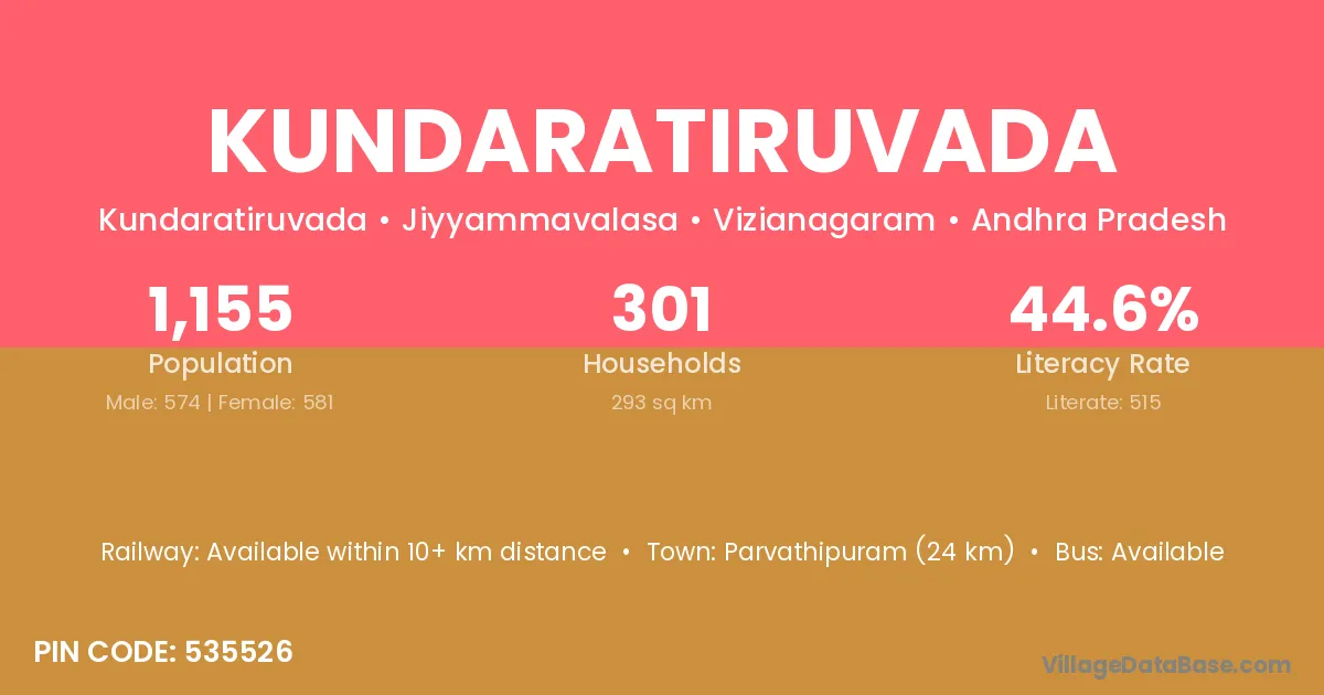 Parvathipuram (24 km) is the nearest town to Kundaratiruvada village for major economic activities and is located approximately 24 km away.