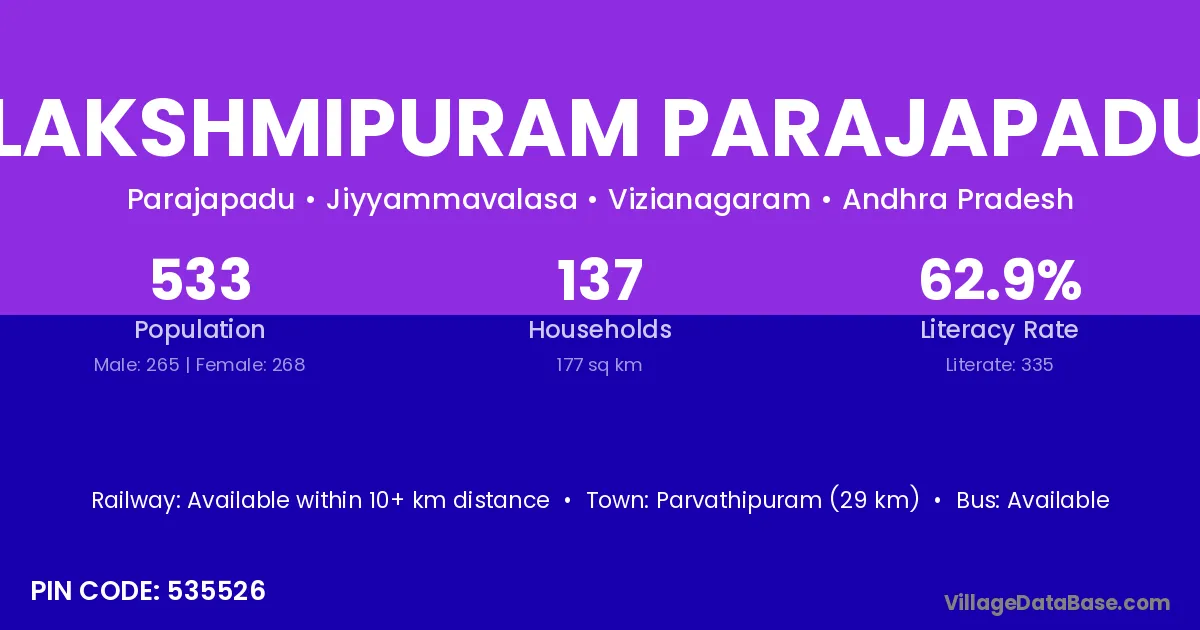 Lakshmipuram Parajapadu village has a total population of 533 people, of which 265 are males and 268 are females.