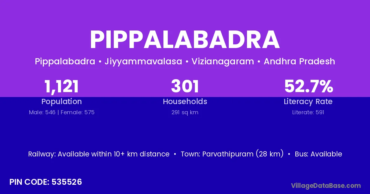 Parvathipuram (28 km) is the nearest town to Pippalabadra village for major economic activities and is located approximately 28 km away.