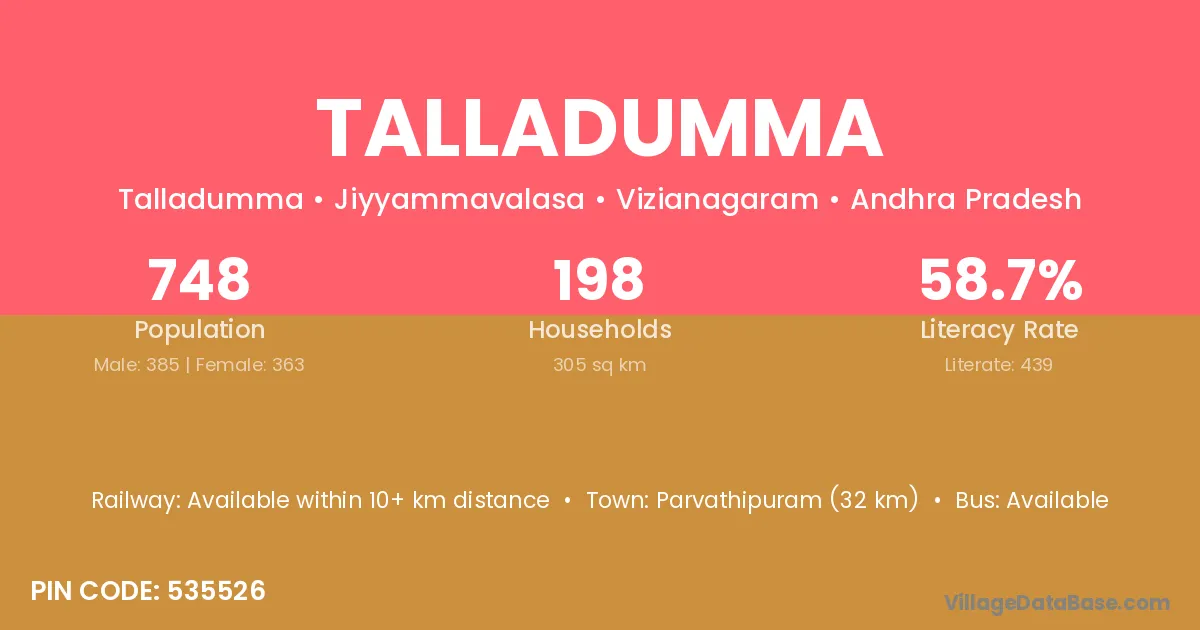 Parvathipuram (32 km) is the nearest town to Talladumma village for major economic activities and is located approximately 32 km away.