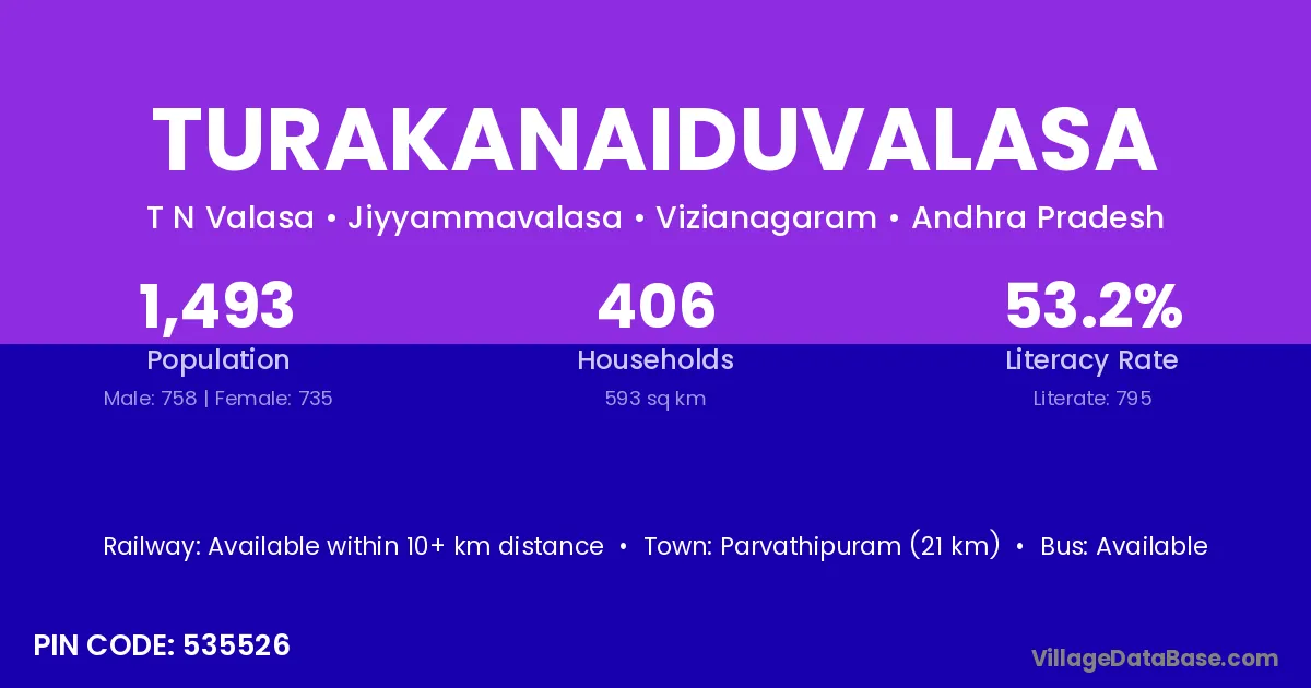 Parvathipuram (21 km) is the nearest town to Turakanaiduvalasa village for major economic activities and is located approximately 21 km away.