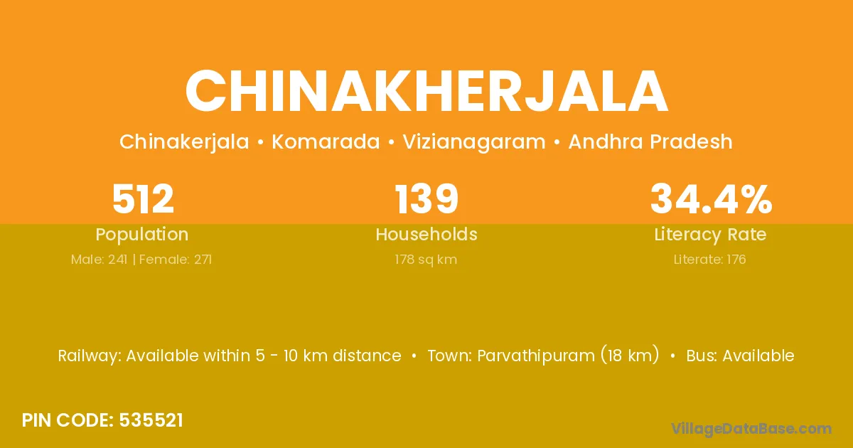 Parvathipuram (18 km) is the nearest town to Chinakherjala village for major economic activities and is located approximately 18 km away.