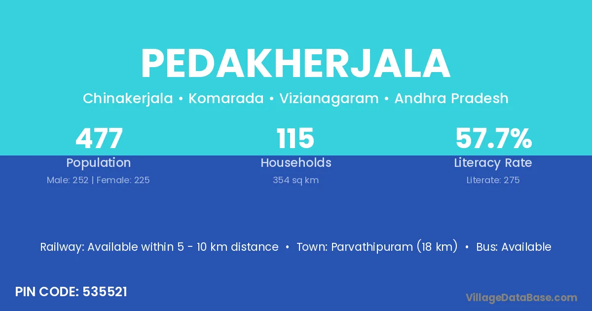 Parvathipuram (18 km) is the nearest town to Pedakherjala village for major economic activities and is located approximately 18 km away.