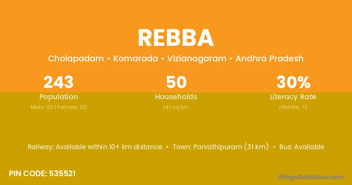Parvathipuram (31 km) is the nearest town to Rebba village for major economic activities and is located approximately 31 km away.