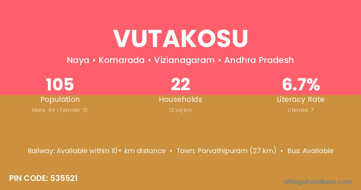 The literacy rate of Vutakosu village is 6.67%. Male literacy stands at 2.27% and female literacy at 9.84%.