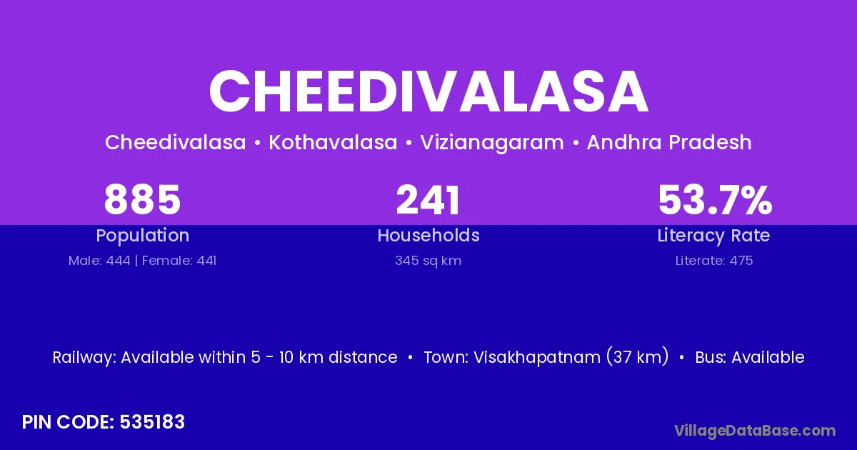 Cheedivalasa village has a total population of 885 people, of which 444 are males and 441 are females.