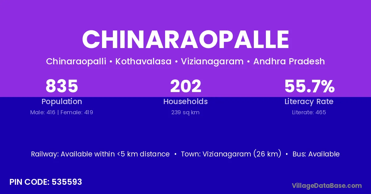 Chinaraopalle village has a total population of 835 people, of which 416 are males and 419 are females.
