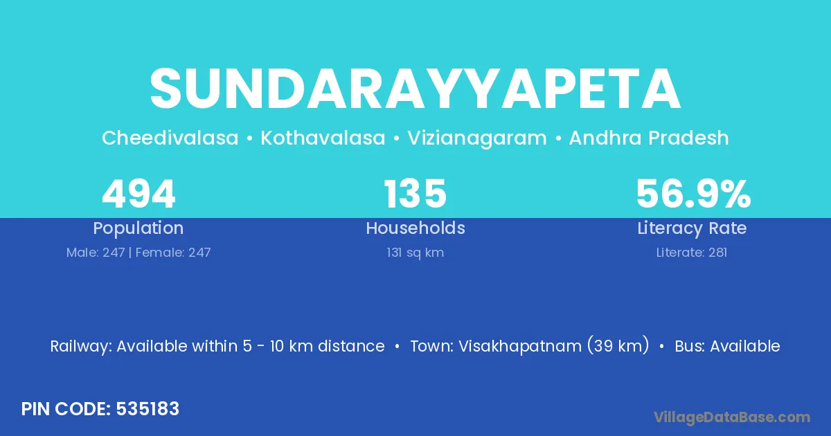 Sundarayyapeta village has a total population of 494 people, of which 247 are males and 247 are females.