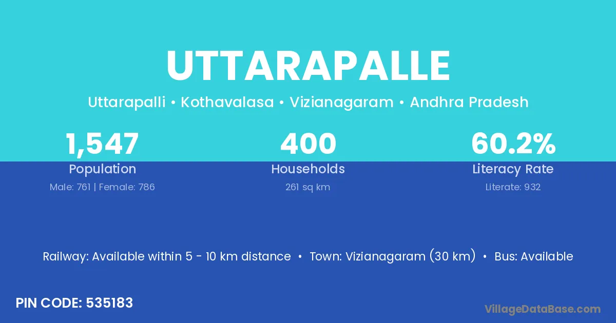 Vizianagaram (30 km) is the nearest town to Uttarapalle village for major economic activities and is located approximately 30 km away.