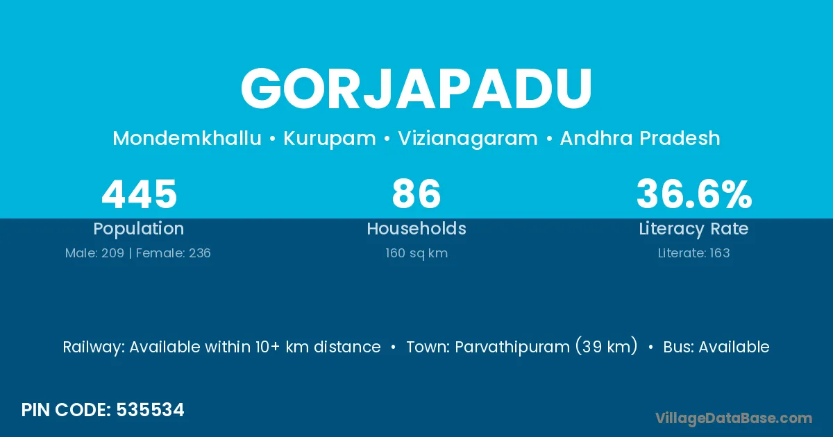 Parvathipuram (39 km) is the nearest town to Gorjapadu village for major economic activities and is located approximately 39 km away.