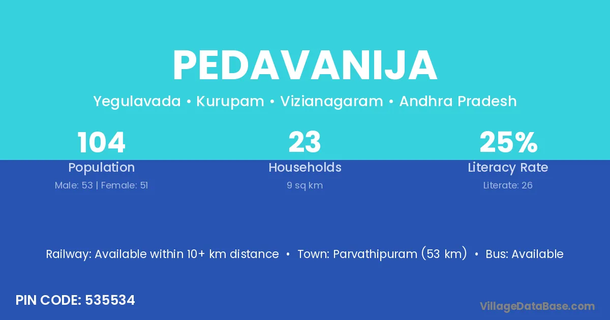 Parvathipuram (53 km) is the nearest town to Pedavanija village for major economic activities and is located approximately 53 km away.