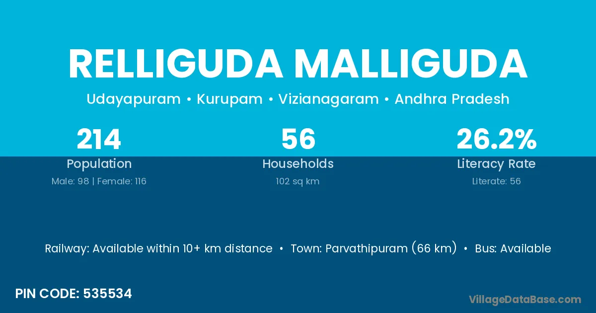 Relliguda Malliguda village has a total population of 214 people, of which 98 are males and 116 are females.