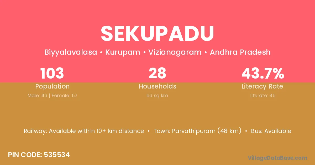 Parvathipuram (48 km) is the nearest town to Sekupadu village for major economic activities and is located approximately 48 km away.