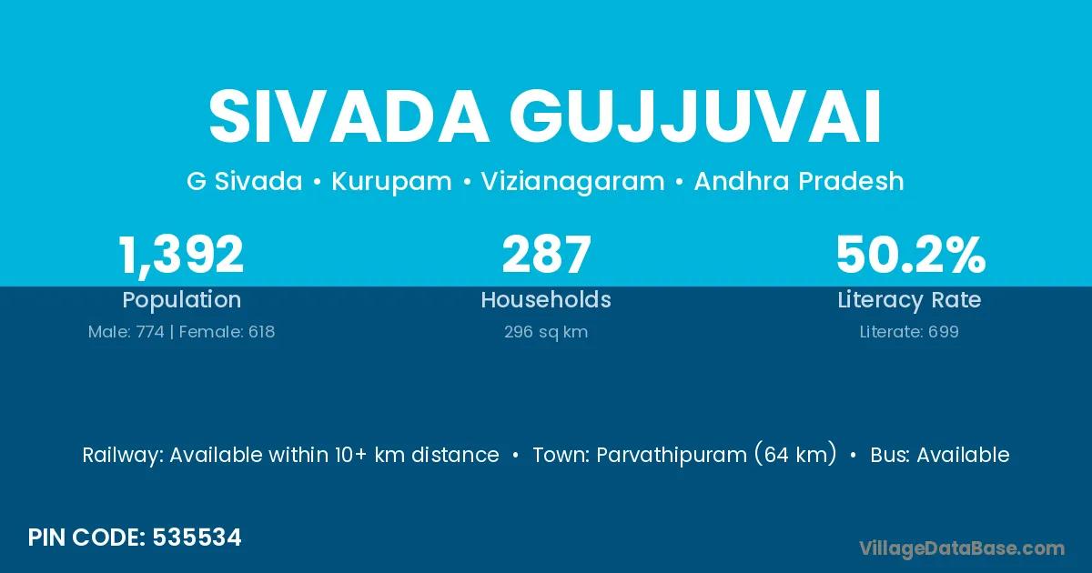 Parvathipuram (64 km) is the nearest town to Sivada Gujjuvai village for major economic activities and is located approximately 64 km away.