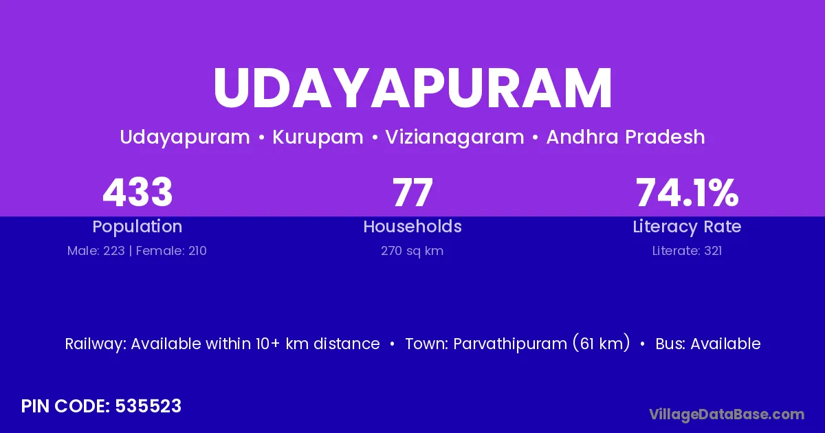 Udayapuram village has a total population of 433 people, of which 223 are males and 210 are females.