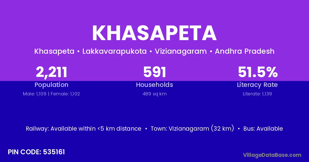 Khasapeta village has a total population of 2,211 people, of which 1,109 are males and 1,102 are females.