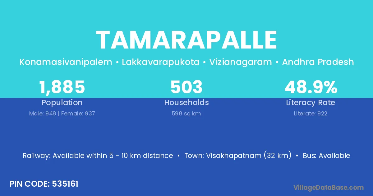 Tamarapalle village has a total population of 1,885 people, of which 948 are males and 937 are females.