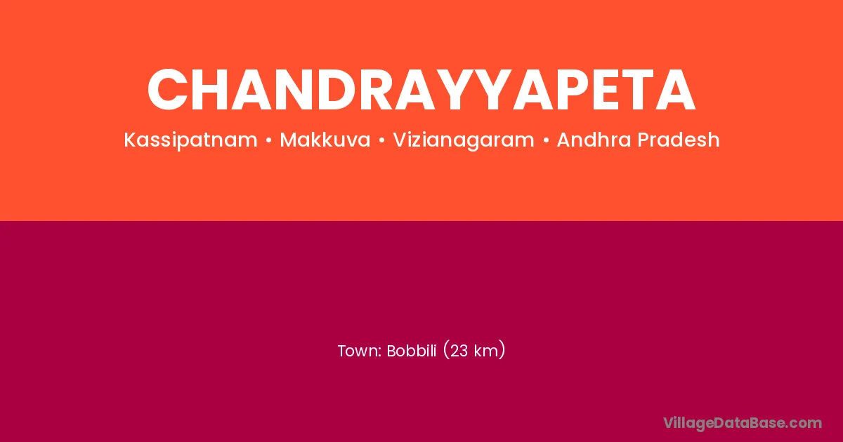 Bobbili (23 km) is the nearest town to Chandrayyapeta village for major economic activities and is located approximately 23 km away.
