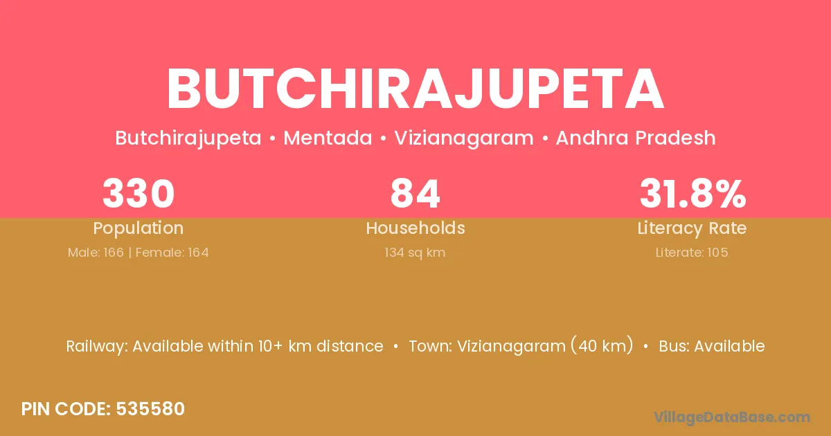 Vizianagaram (40 km) is the nearest town to Butchirajupeta village for major economic activities and is located approximately 40 km away.