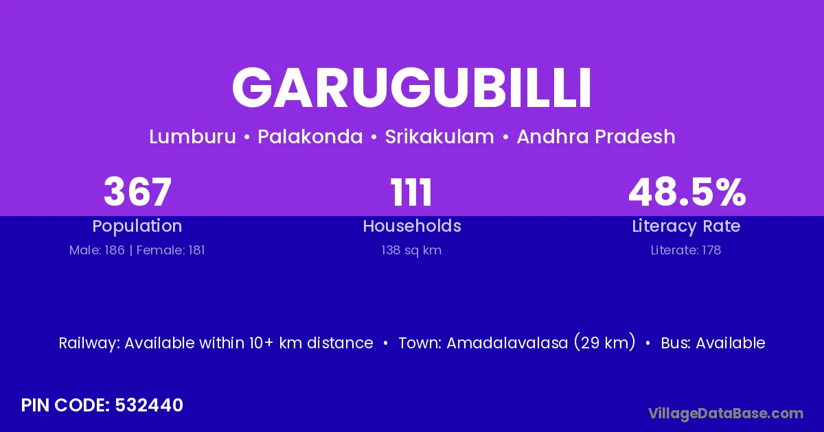 The literacy rate of Garugubilli village is 45.91%. Male literacy stands at 53.36% and female literacy at 37.86%.