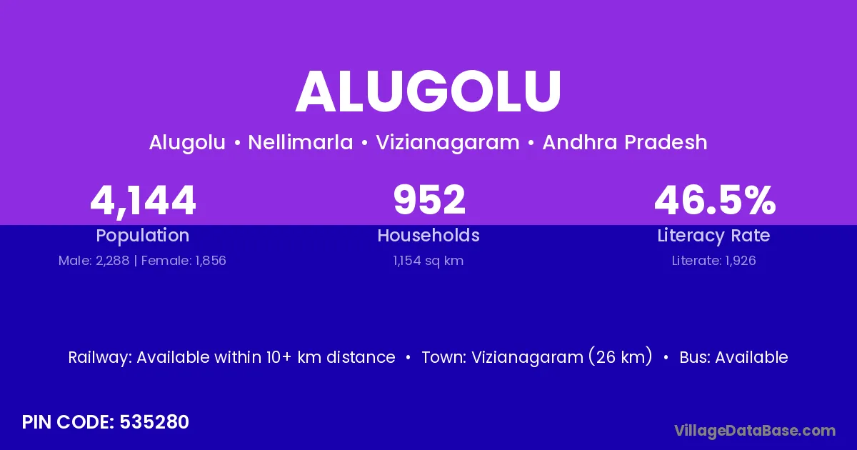 Vizianagaram (26 km) is the nearest town to Alugolu village for major economic activities and is located approximately 26 km away.