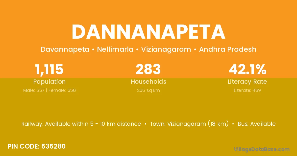Vizianagaram (18 km) is the nearest town to Dannanapeta village for major economic activities and is located approximately 18 km away.