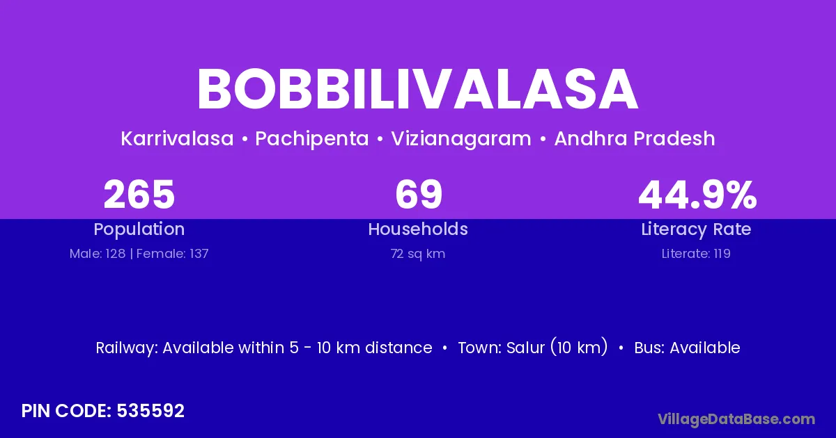 Bobbilivalasa village has a total population of 265 people, of which 128 are males and 137 are females.