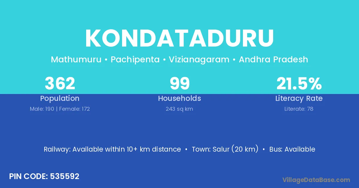 Salur (20 km) is the nearest town to Kondataduru village for major economic activities and is located approximately 20 km away.