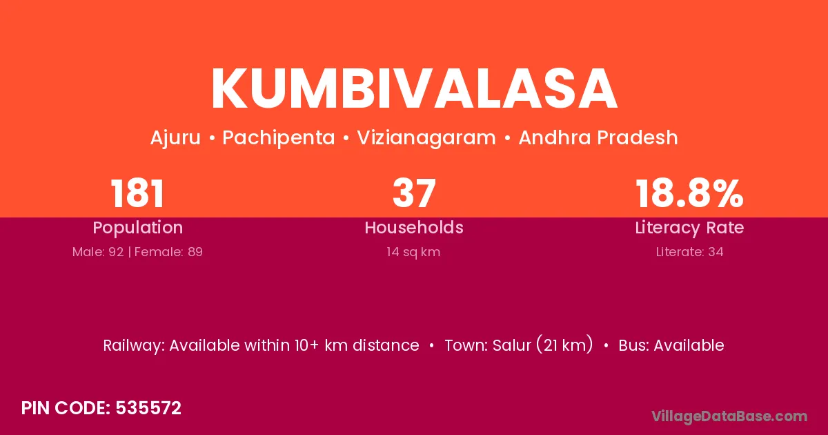 Kumbivalasa village has a total population of 181 people, of which 92 are males and 89 are females.
