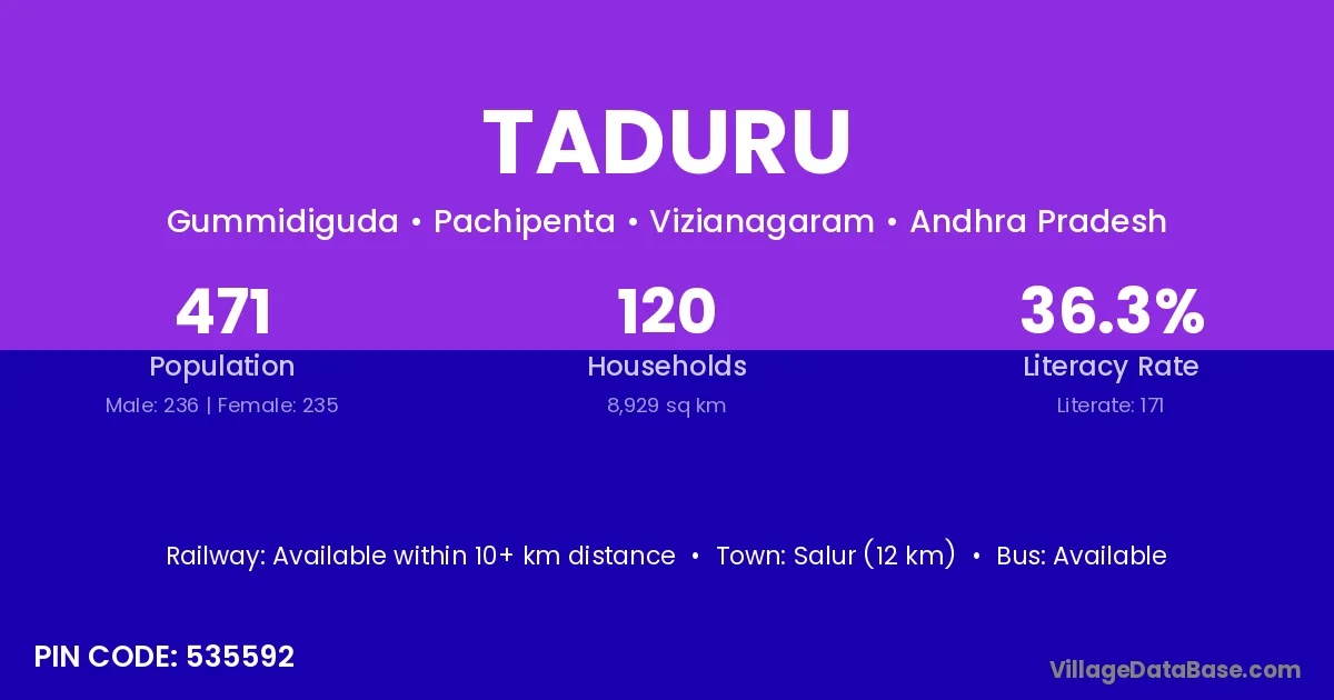 Salur (12 km) is the nearest town to Taduru village for major economic activities and is located approximately 12 km away.
