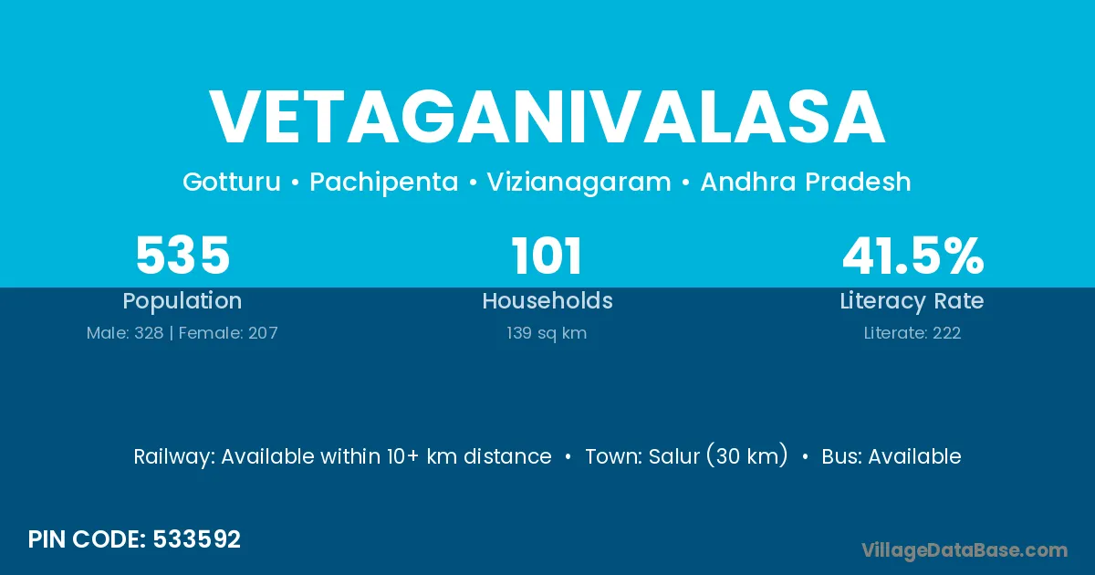 The literacy rate of Vetaganivalasa village is 41.50%. Male literacy stands at 56.10% and female literacy at 18.36%.