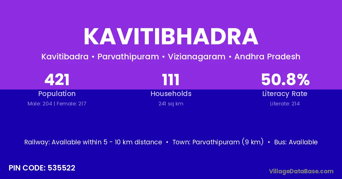 Parvathipuram (9 km) is the nearest town to Kavitibhadra village for major economic activities and is located approximately 9 km away.