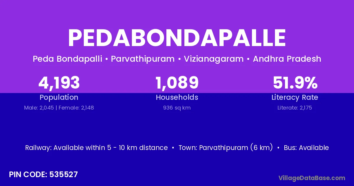 Parvathipuram (6 km) is the nearest town to Pedabondapalle village for major economic activities and is located approximately 6 km away.