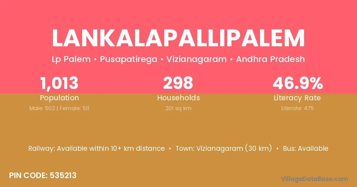 Lankalapallipalem village has a total population of 1,013 people, of which 502 are males and 511 are females.