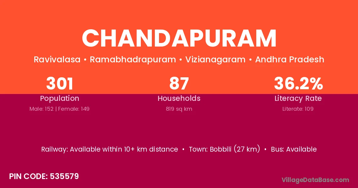 Bobbili (27 km) is the nearest town to Chandapuram village for major economic activities and is located approximately 27 km away.