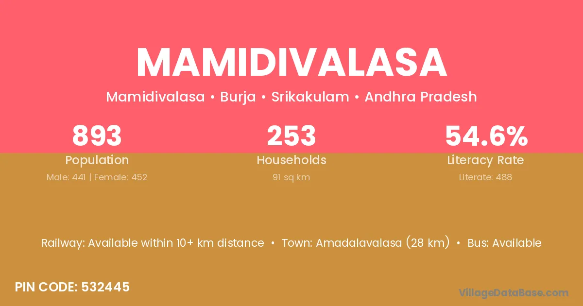 Mamidivalasa village has a total population of 1,016 people, of which 516 are males and 500 are females.