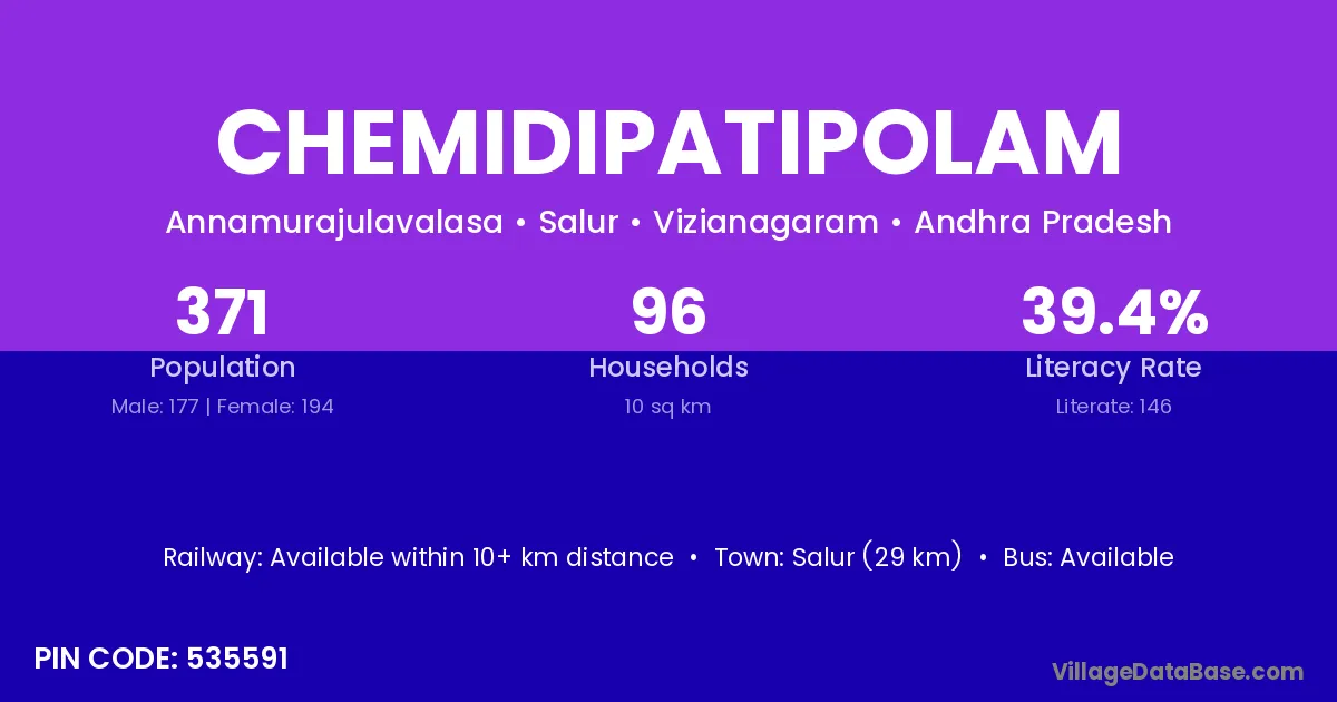 The literacy rate of Chemidipatipolam village is 39.35%. Male literacy stands at 48.59% and female literacy at 30.93%.