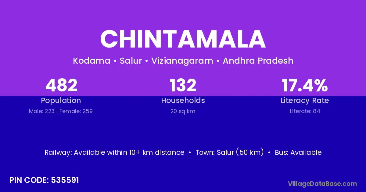 Salur (50 km) is the nearest town to Chintamala village for major economic activities and is located approximately 50 km away.