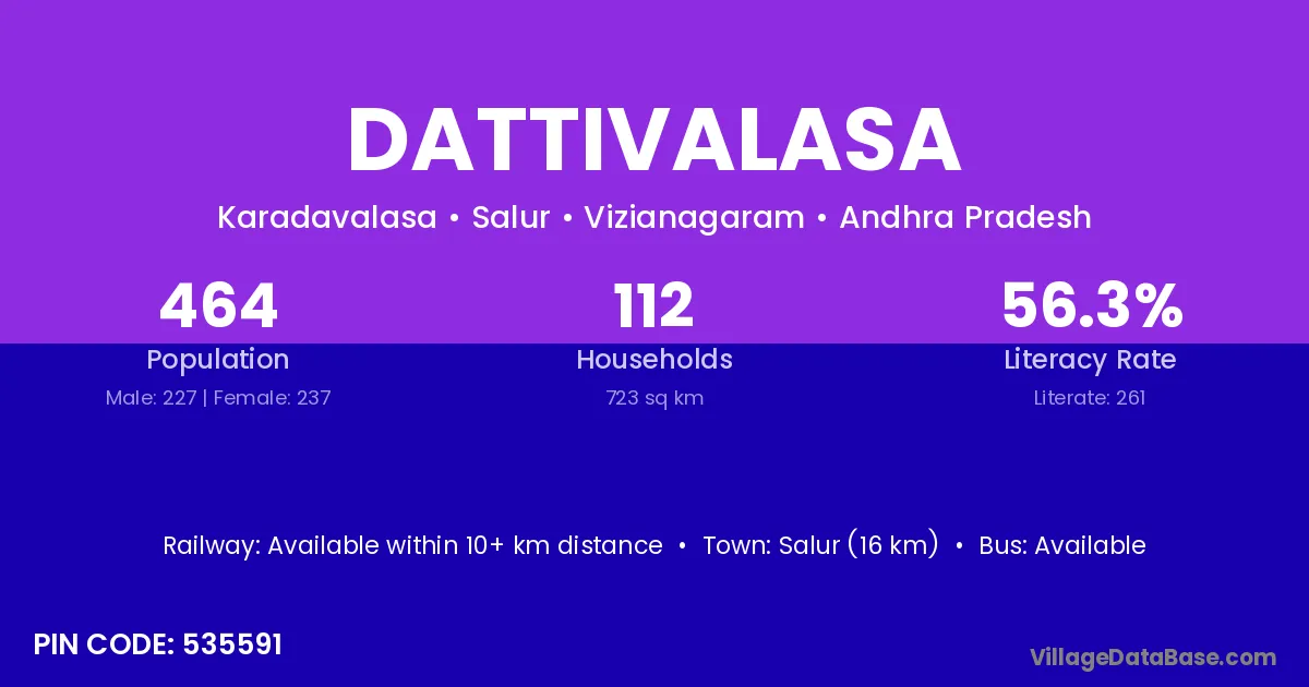 Salur (16 km) is the nearest town to Dattivalasa village for major economic activities and is located approximately 16 km away.