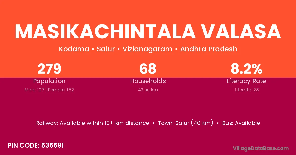 Salur (40 km) is the nearest town to Masikachintala Valasa village for major economic activities and is located approximately 40 km away.