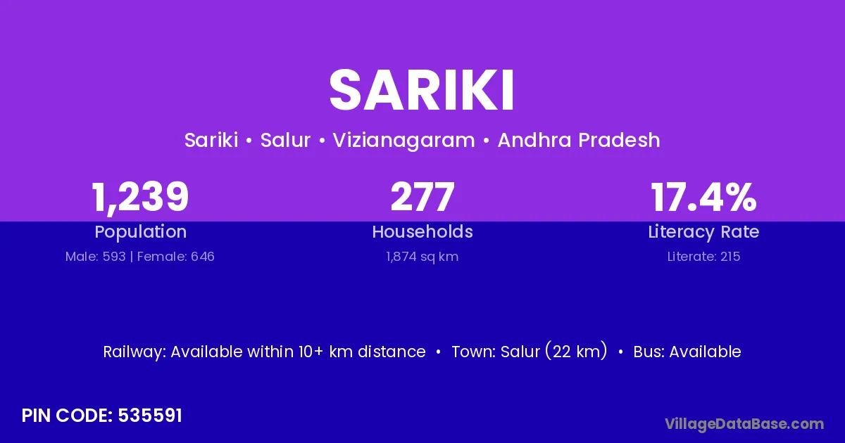 Sariki village has a total population of 1,239 people, of which 593 are males and 646 are females.