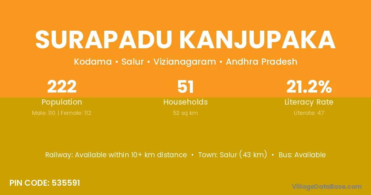 Salur (43 km) is the nearest town to Surapadu Kanjupaka village for major economic activities and is located approximately 43 km away.