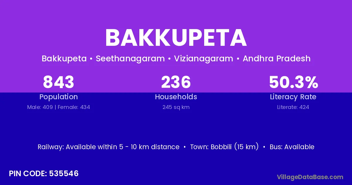 Bobbili (15 km) is the nearest town to Bakkupeta village for major economic activities and is located approximately 15 km away.