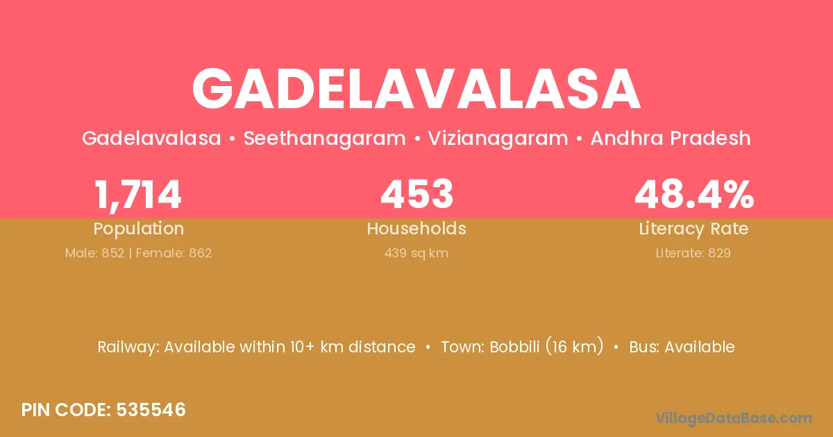 Gadelavalasa village has a total population of 1,714 people, of which 852 are males and 862 are females.