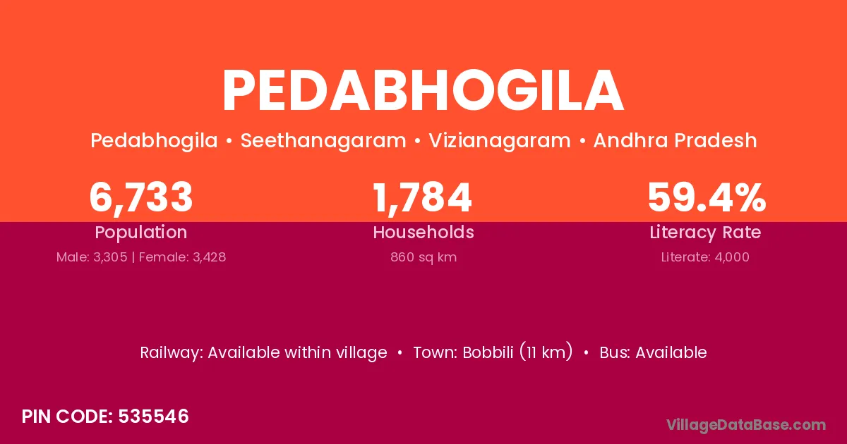Pedabhogila village has a total population of 6,733 people, of which 3,305 are males and 3,428 are females.