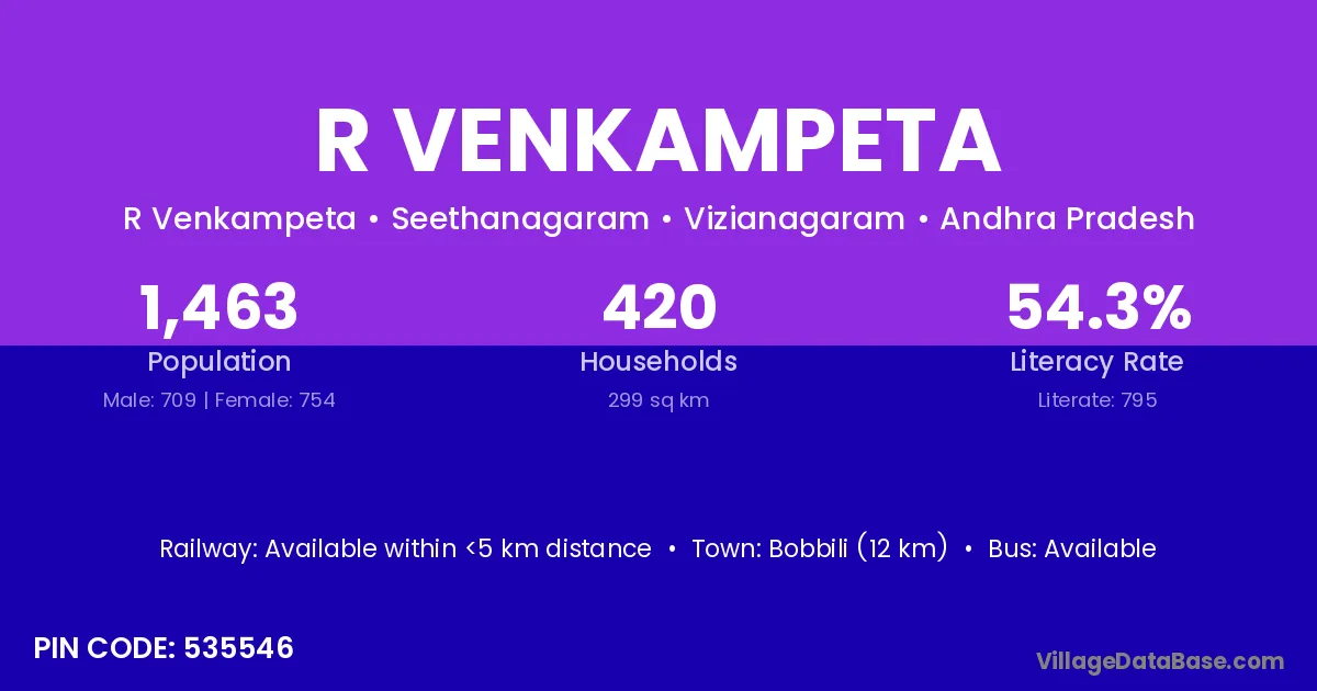 Bobbili (12 km) is the nearest town to R Venkampeta village for major economic activities and is located approximately 12 km away.