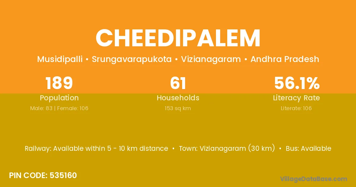 Vizianagaram (30 km) is the nearest town to Cheedipalem village for major economic activities and is located approximately 30 km away.