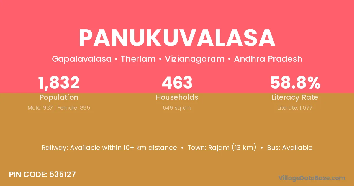 Rajam (13 km) is the nearest town to Panukuvalasa village for major economic activities and is located approximately 13 km away.