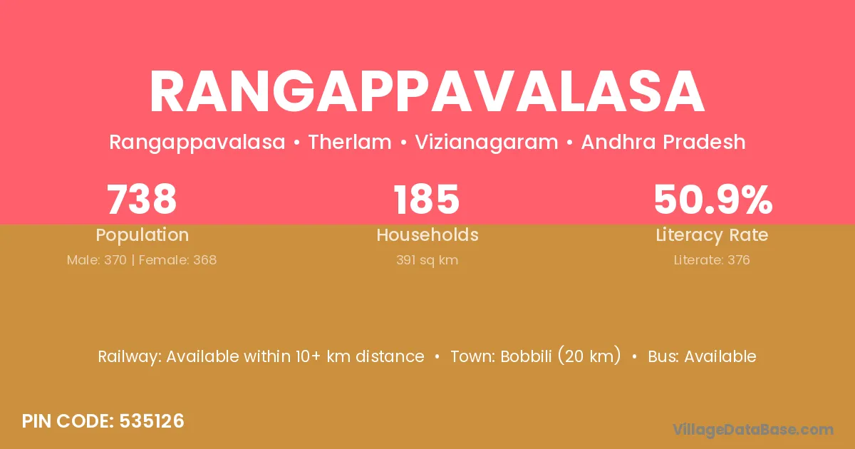 Rangappavalasa village has a total population of 738 people, of which 370 are males and 368 are females.