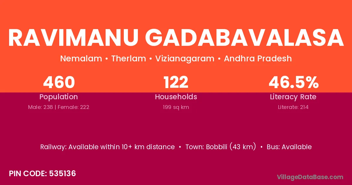 Ravimanu Gadabavalasa village has a total population of 460 people, of which 238 are males and 222 are females.